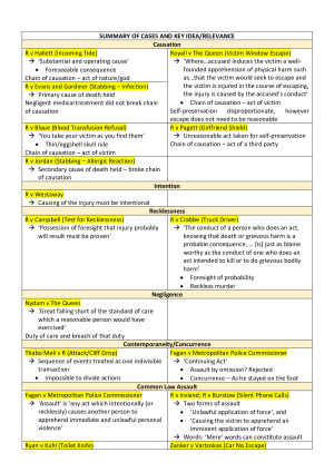 These notes provide a brief outline of cases and structured answers for each offence. The structured answer should act as a guideline, allowing you to easily adapt and apply them to a specific question. The elements of each offence that must be proven are clearly set out, for ease during the exam. The topics covered are: - Topic 5: Non-Fatal Offences - Topic 6: Sexual Offences - Topic 7: Homicide (Murder/Manslaughter) - Topic 8: Defences