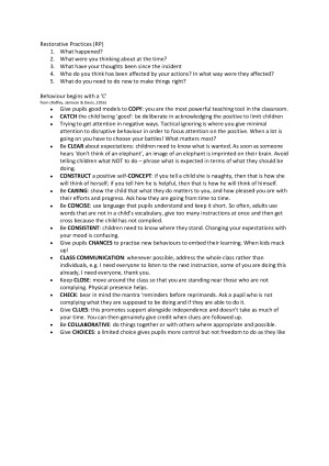 ETP200 notes- group class presentations happened throughout the trimester and produced information written down. Week 1: Positive learning environments Week 2: Discipline Week 3: Challenging behaviour Week 4: Building home-school relationships with diverse learners Week 7: Building self-regulation Week 8: Psychoeducation