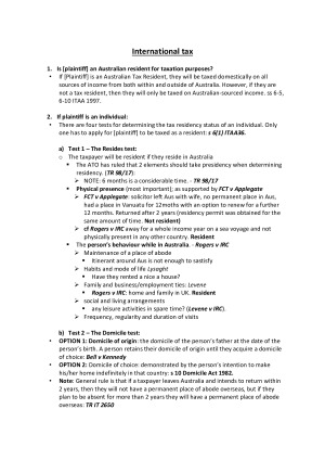 I managed to score a 94 HD overall and received a prize for being the highest achiever in the course. To do well in this course, you need to familiarise yourself with all the case laws and be able to apply relevant case laws in the given scenarios during the exam. I summarised all the content covered during the course, including the CASE LAWS so that the notes can be used directly in the final exam. You will save so much time preparing for your exam by purchasing these notes and you will not be disappointed! The notes cover every topic of the course, including: 1. Calculating income tax payable/refundable 2. International tax 3. Ordinary Income 4. Capital gains tax 5. Statutory income 6. Non-assessable income 7. General Deductions 8. Specific Deductions 9. Timing of a receipt 10. Tax Entities & Franking Credits