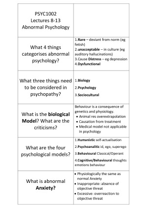 Flash Cards of all lectures for PSYC1002, Semester 2 2021 Lectures 1-7 - Motivation Lectures 8-13 - Abnormal Psychology Lectures 14-20 - Neuroscience Lectures 21 - 26 - Intelligence/Mental Abilities Lectures 27 - 33 - Cognitive processes Lectures 34-40 - Perception
