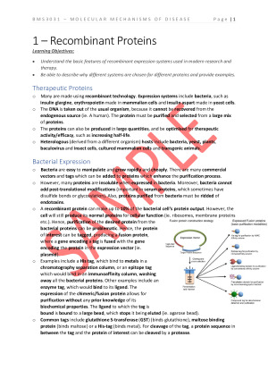 Lecture summaries including learning objectives for every BMS3031 lecture. Easy to understand language and comprehensive, used by many students for HD marks. This is a capstone (12 credit point) unit, and the last before GPA's are submitted to GEMSAS, so be sure to give it your all. The price is a bit higher because of the sheer enormity/length of these notes and the effort that went into them. Lectures included: 1 - Recombinant Proteins 2 - Antibodies and Therapy 3 & 4 - Precision Medicine and Genetic Approaches to Disease Therapy (i & ii) 5 & 6 - Drug Discovery (i & ii) 7 & 8 - Pharmacokinetics (i & ii) 9 & 10 - Assessing Drug Safety and Drug Development (i & ii) 11 & 12 - Molecular Basis for Drug Action - Case Study: Agomelatine (i & ii) 13 - Overview of Immunity, Tolerance, and Hypersensitivity 14 - B Lymphocyte Biology: The Response to Antigen 15 - Monoclonal Antibodies 16 - Autoimmunity 17 - The Hallmarks of Cancer 18 - Tumour Suppressor Genes, Oncogenes, and Methods for Cancer Screening 19 - Skin Cancer (i) 20 - Skin Cancer (ii): Melanoma 21 - Medulloblastoma 22 - Kinase Inhibitors 23 - Antibody Therapies 24 - Stratified Medicine for Cancer 25 - Introduction to DOHaD 26 - Developmental Programming of Hypertension and Chronic Kidney Disease 27 - Nephron Number, Hypertension, and CKD in Humans 28 - Mechanisms of DOHaD - Epigenetics and Transgenerational Transmission 29 - Antenatal Interventions to Improve Long-Term Outcomes 30 - Future Opportunities to 'Access' the Foetus and Long-Term Health Outcomes 31 - Antibiotic Selectivity and Mode of Action 32 - Antibiotic Resistance 33 - Challenges in Antimicrobial Development 34 - Antimicrobial Agents and Resistance: Case Studies 35 - Basics of Virology 36 - Phage Therapy 37 - Viral Immunology 38 - How Virus Infections Have Shaped Our World 39 - Mechanisms of Protein Folding and Aggregation 40 - Polyglutamine Disease 41 - Alzheimer's Disease 42 - Prion Disease and ALS