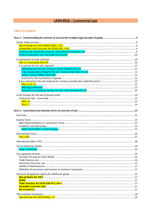 This is a FULL SET of Business Association notes from trimester 1 2021. I received 88 in this course and was taught by the incredible Scott Donald. These notes also include ALL THEORY READINGS NOTES as preparation for the mid term assignment. This is a FULL SET of LAWS3018 Commercial Law elective notes from Trimester 3 2021. I received 85 in this course. These notes contain all cases for the course which are to be used in both the mid-term problem question assignment, and the final exam which is also a problem question. The topics include: - Class 1 – Understanding the contract of sale and the multiple legal concepts of goods - Class 2 – Contractual and statutory terms of contracts of sale - Class 3 – The importance of accurate and precise description of the goods; correspondence with sample - Class 4 – Fitness for purpose - Class 5 – Merchantability - Class 6 – Fragmentation of property and commercial torts, when is possession legally recognised? - Class 7 – Finders keepers?, Property, possession and transfer of risk - Class 8 – Property, possession and transfer of risk (Cont.) - Class 9 – Bailment of Goods - Class 10 + 11 – Challenges to Ownership: nemo dat quod habet and its exceptions - Class 12 – Performance and Breach in the Sale of Goods - Class 13 – Performance and Breach in the Sale of Goods (Continued) - Class 14 + 15 – Contractual bases of agency law; communications of agents; ratification of agency - Class 16 – Agents and Third Parties; The Doctrine of the Undisclosed Principle - Class 17+18 – Mercantile Agents and problems of apparent authority