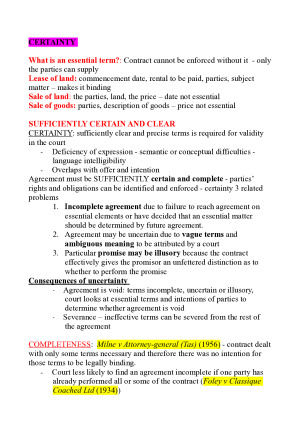 Summary notes on key concepts, authorities and statutes. Used in my exam when referring to authorities and summarising principles. These notes are not extensively detailed, they are concisely summarised. Topics included: - Offer - Acceptance - Consideration - Intention - Certainty - Illusory Promise - Formalities - Part Performance - Capacity - Privity - Express terms - Parole Evidence Rule - Construction - Exclusionary Clauses - Gap Filling - Implied Terms - Statutory Guaratnees - Termination - Breach - Repudiation - Vitiating Factors; - Frustration, - Misrepresentation, - Mistake - Duress - Undue Influence - Unconscionable Conduct - Remedies; - Third Part Impropriety, - Wives Equity, - Termination/Recission - Election - Actions for Debt - Alternative Cause of Action