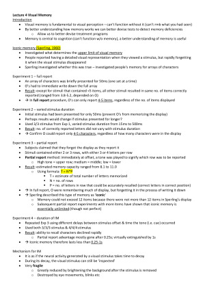 Clear and comprehensive notes that covered all the examinable content and details of key experiments. Note that images of experiment results are removed for copyright reason. PMC is the most difficult subject I've done in Uni, but also extremely rewarding as you will gain an in-depth understanding of cog psyc. I received a final mark of 96 for PMC. Topics covered: Piers Howe Section 1 Lightness Perception 2 Multiple Object Tracking 3 Selective Attention and Visual Awareness & Visual Search 4 Visual Memory Phillip Smith Section 5 Classical Psychophysics & the Measurement of Sensation: Historical Origins 6 Signal Detection Theory & Reaction Times 7 Complex Decision Making: Judgement and Decision Making in the Real World Dan Little Section 8 Feature Processing in Categorisation 9 Information Processing & Cognition 10 Information Processing & Memory Search 11 Neuroscience and Systems of Categorisation & Recognition