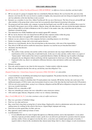 These notes include case summaries for each topic covered in the Equity unit. They are very useful when needing to include cases in exam answers to apply an exam scenario to. Topics include: - Rule against Penalties; - Estoppel; - Undue influence; - Unconscionable conduct - Fiduciary obligations -
