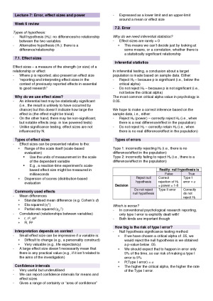 These notes cover all content from mid-sem break onwards. They are helpful in understanding complex statistical processes - , ANOVA. They cover the following topics in a neat format: - Error, effect sizes, and power - T-tests - one sample, independent samples, paired samples - ANOVA - one-way between groups, one-way repeated measures, mixed between-within subjects, two-way between-groups, multivariate ANOVA, analysis of covariance - Correlation and regression - including multilinear regression