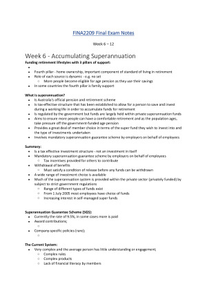 FINA2209 - EXAM NOTES WK 6 - 12 HD STUDENT WK6 - ACCUMULATING SUPERANNUATION WK 8 - RETIREMENT PLANNING WK 9 - SOCIAL SECURITY WK 10 - ESTATE PLANNING WK 11 - ASSET PROTECTION WK 12 - SELF-MANAGED SUPERANNUATION FUNDS