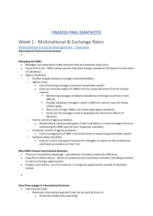 FINA3326 FINAL EXAM NOTES - HD STUDENT Week 1 - Multinational & Exchange Rates Week 2 - Exchange Rate Determination Week 3 - Foreign Exchange Derivatives Week 4 - Speculation, Arbitrage & IR Parity Week 5 - Parity Conditions Week 6 - Forecasting FX, Measuring Exposure, Managing Economic/Translation Exposure Week 7 - Transaction Exposure Management Week 8 - Global Financing Week 9 - Foreign Direct Investment & Country Risk Week 10 - International Corporate Governance Week 11 - Multinational Cost of Capital Week 12 - Multinational Capital Budgeting