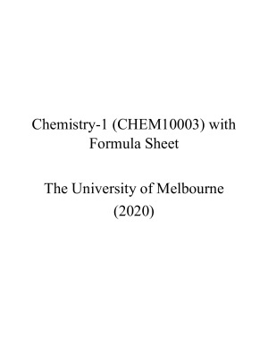 A complete set of notes for Chemistry 1 covering all area of studies that you would ever need. It follows a topic-by-topic structure in chorological order of the lectures, summarizing concepts and definitions with succinct dot points and supplementary diagrams, with all information categorized into a hierarchy of topics and sub-topics. It also comes with a COMPLEMETARY FORMULA SHEET for all mathematical formulas covered in this subject. This is catered for the deadline fighters who simply want to Ctrl-F the whole subject with only one single document, the intellectually curious who are perhaps interested in getting ahead, and the study-holics who everything the lecture has covered to get that sweet H1 score. The 12-week contents of the summary notes include: 1. structure and bonding of alkanes, alkenes and alkynes; 2. benzene and its derivatives; functional groups; 3. spectroscopy and determination of structure; 4. gases; 5. energy and thermochemistry; 6. chemical equilibrium; 7. acid-base chemistry; 8. properties of solutions; 9. aspects of main group chemistry; 10. structure and bonding in elements and compounds of groups 14-18; 11. solutions and pH equilibria; physical properties of solution; 12. intermolecular forces and extended solid state structures Check out my summary notes for other level 1 to 3 science subjects on your right!