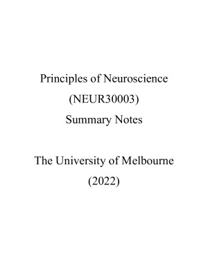 A complete set of notes for Principles of Neuro covering all area of studies that you would ever need. It follows a topic-by-topic structure in chorological order of the lectures, summarizing concepts and definitions with succinct dot points and supplementary diagrams, with all information categorized into a hierarchy of topics and sub-topics. This is catered for the deadline fighters who simply want to Ctrl-F the whole subject with only one single document, the intellectually curious who are perhaps interested in getting ahead, and the study-holics who everything the lecture has covered to get that sweet H1 score. The 12-week contents of the summary notes include: - Introduction to Neuroscience - Sensory and effector systems - Motor movement - Neuropsychology Check out my summary notes for other level 1 to 3 science subjects on your right!