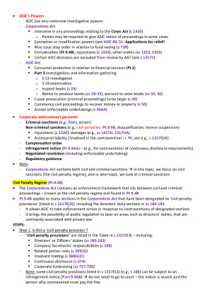 Excellent and super detailed final exam notes prepared by a Distinction student. Super useful for final exam revisions Topics 1) History of Corporate Law 2) Corporate Fundraising (Debt vs Equity) 3) Corporate Personality 4) Corporate Constitution & Decision-making Organs 5) Company Meetings 6) Corporate Attribution & Liability (Tort, Criminal law, Contract) 7) Directors Duties 1 8) Directors Duties 2 9) Directors Duties 3 10) Members’ Remedies