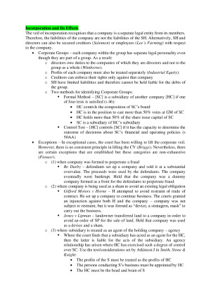 Templated notes. The topics included are: 1. Incorporation and its Effects 2. Constitution and Replaceable Rules 3. Company Contracting 4. Share Capital, Debt Capital and Dividends 5. Directors, Member and Corporate Decision Making 6. Directors' Duties 7. Consequences of Breach 8. Members' Remedies Warning: please use these notes merely as guide. You must avoid engaging in academic dishonesty.