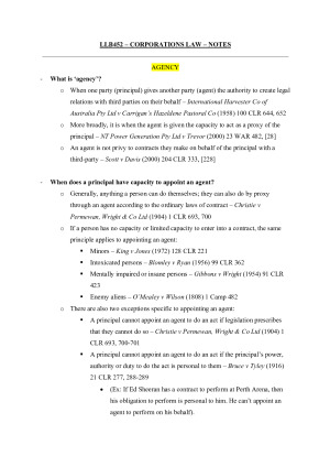 Comprehensive notes for LLB452 Corporations Law with topics including: - agency; - partnership; - nature of corporations; - directors' duties; - corporate constitutions; and - insolvency.