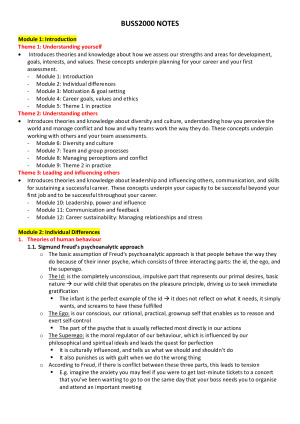 Excellent summary notes for all Topics of the course prepared by a HD student - very useful for exams and in-class participation marks!!! Topics: Understanding yourself - Module 1: Introduction - Module 2: Individual differences - Module 3: Motivation & goal setting - Module 4: Career goals, values and ethics - Module 5: Theme 1 in practice Understanding others - Module 6: Diversity and culture - Module 7: Team and group processes - Module 8: Managing perceptions and conflict - Module 9: Theme 2 in practice Leading and influencing others - Module 10: Leadership, power and influence - Module 11: Communication and feedback - Module 12: Career sustainability: Managing relationships and stress
