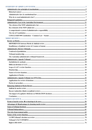 I used these notes to receive a High Distinction Mark (86) in Administrative Law in 2022 T3. These notes have been comprehensively put together from the reading guide and sorted into each week. They contain theorist critiques of foundational theories and case summaries of every case included in the reading guide (including MERIT REVIEW & JUDICIAL REVIEW). My notes are 318 pages (the most detailed note on the market) and are all COLOUR CODED and NEATLY ORGANISED into different subsections, tables and headings. Having notes COLOUR CODED and NEATLY ORGANISED was a real asset in a time-pressured exam. PLEASE SEE (High Distinction - Administrative Law EXAM note) under my profile. VERY USEFUL for the final exam.
