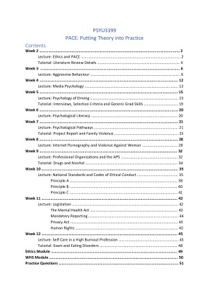 Hi!! Thank you for checking out my notes! This unit was tough and has a huge focus on ethics which my notes reflect - including the ethics and WHS modules. I've condensed the information into a simple format making it easy to study for assignments and exams. I've also taken the time to write down extra notes that helped me remember content. The notes I took from tutorials are extremely detailed and is definitely what I attribute to helping me get a HD on the project report and literature review. My notes also include a bunch of practice multiple choice questions that I wrote. These questions are of a similar style to the final exam and will accurately help in testing your knowledge. The table of contents is as follows: Week 2 - Lecture: Ethics and PACE - Tutorial: Literature Review Details Week 3 - Lecture: Aggressive Behaviour Week 4 - Lecture: Media Psychology Week 5 - Lecture: Psychology of Driving - Tutorial: Interviews, Selection Criteria and Generic Grad Skills Week 6 - Lecture: Psychological Literacy Week 7 - Lecture: Psychological Pathways - Tutorial: Project Report and Family Violence Week 8 - Lecture: Internet Pornography and Violence Against Woman Week 9 - Lecture: Professional Organisations and the APS - Tutorial: Drugs and Alcohol Week 10 - Lecture: National Standards and Codes of Ethical Conduct -> Principle A -> Principle B -> Principle C Week 11 - Lecture: Legislation ->The Mental Health Act -> Mandatory Reporting -> Privacy Act -> Human Rights Week 12 - Lecture: Self Care in a High Burnout Profession - Tutorial: Exam and Eating Disorders Ethics Module WHS Module Practice Questions