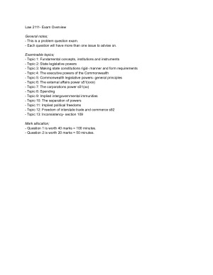 These are the notes that I used to receive an 85 in law 2111. I made these notes using the required textbook, lectures, tutorials, lexis nexis study guides and various other textbooks on statutory interpretation in the library. They contain a summary for all of the thirteen topics and the exam script I used. Topic 1: Fundamental concepts, institutions and instruments Topic 2: State legislative powers Topic 3: Making state constitutions rigid- manner and form requirements Topic 4: The executive powers of the Commonwealth Topic 5: Commonwealth legislative powers- general principles Topic 6: The external affairs power s51(xxix) Topic 7: The corporations power s51(xx) Topic 8: Spending Topic 9: Implied intergovernmental immunities Topic 10: The separation of powers Topic 11: Implied political freedoms Topic 12: Freedom of interstate trade and commerce s92 Topic 13: Inconsistency- section 109