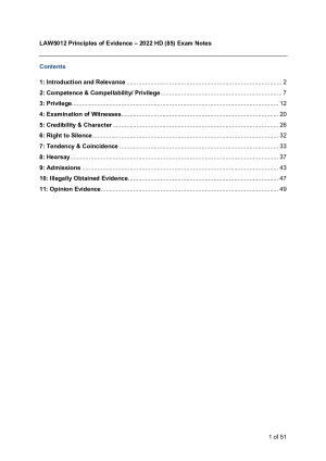 Comprehensive exam notes for LAW5012 Principles of Evidence including examples, introductory sentences and step-by-step answer structure. These notes enabled me to achieve over 90 on the exam and 85 in the unit overall. Topic 1: Introduction and Relevance Topic 2: Competence & Compellability/ Privilege Topic 3: Privilege Topic 4: Examination of Witnesses Topic 5: Credibility & Character Topic 6: Right to Silence Topic 7: Tendency & Coincidence Topic 8: Hearsay Topic 9: Admissions Topic 10: Illegally Obtained Evidence Topic 11: Opinion Evidence