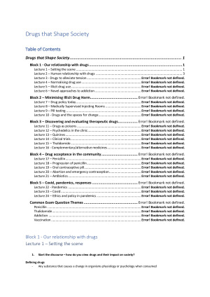 This summary is organised into the five blocks of the subjects: relationships with drugs, minimising ilicit drug harm, discovering and evaluating therapeutic drugs, drug acceptance in community, covid/ pandemics/ responses. They are organised into key learning points from the lectures.