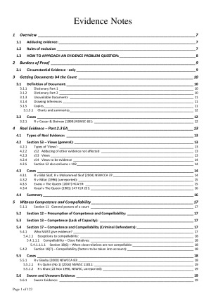 These notes are colour coded and cross referenced and cover all the topics in the course. Lists of all exceptions and rule issues. All cases mentioned in lectures and readings are covered highlighting key principles, facts, issues and outcomes. Detailed index and page numbering makes it easy to find things. These notes have everything you need for both study and exam and they are meticulous - every principle has the case citation or legislation so there is no guesswork. Evidence is hard and I got 88% in the exam using these notes.