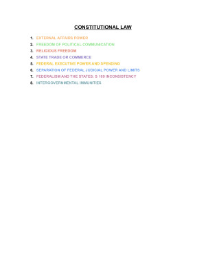 These notes begin with concise structures for each topic (eg. step-by-step process of answering the relevant questions) then also provide detailed overviews of the topic and case summaries. Topics covered are: - External Affairs Power; - Freedom of Political Communication; - Religious Freedom; - State Trade or Commerce; - Federal Executive Power and Spending; - Separation of Federal Judicial Power and Limits; - Federalism and the States: s 109 Inconsistency; and - Intergovernmental Immunities. While these notes are in-depth, they are completely colour-coded and organised, with all cases and legislation highlighted for clarity. The case summaries provide the facts, findings, and legal rules in a table. I used the structures at the beginning of the notes for my exam and made reference to the more detailed notes/case summaries where I needed clarification or context.