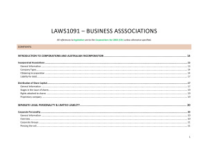 These notes are framework-style and cover all topics in the BA course. Notes and cases are colour-coded, with full case briefs at the end of the document for each case covered in the textbook readings. Topics: - Introduction to Corporations and Australian Incorporation - Seperate Legal Personality and Limited Liability - Business Associations other than Companies - Corporate Constitution & Decision-making by the Board of Directors - Decision-making by Shareholders in General Meetings - Attribution of Liability - Directors' Duties - Consequences for Breach of Directors' Duties - External Administration - Shareholder Remedies - Corporate Groups