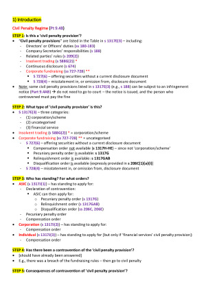 Excellent scaffold for solving exam problem questions! Also includes summaries of each examinable topic (TOPICS 1-5) with important points Super useful material in the mid-semester exam Topics 1) History of Corporate Law 2) Corporate Fundraising (Debt vs Equity) 3) Corporate Personality 4) Corporate Constitution & Decision-making Organs 5) Company Meetings