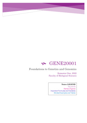 Comprehensive notes from high scoring H1 student (92) for the updated GENE20001 curriculum. The study design of GENE20001 was updated in 2020, and these notes cover the current curriculum of the subject (as of 2022). These notes comprehensively cover all 36 lectures across the 12 weeks, with figures and worked examples included. The notes cover six key modules: - Module One: Genes, Genomes and Gene Expression (L1 - L6) - Module Two: Genetic and Phenotypic Variation (L7 - L12) - Module Three: Transmission Genetics (L13 - L18) - Module Four: Gene Regulation (L19 - L24) - Module Five: Shaping the Genome (L25 - L28) - Module Six: Quantitative and Population Genetics (L29 - L36) Key features of notes include worked examples, relevant figures, bolded key words and module checklists for revision