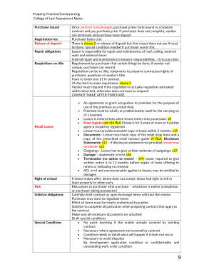 All topics covered for Property Practice College of Law Course in alphabetical order. Easy to read and memorise. In a table. Topics covered include: Mortgages Leases Vendor Obligations Purchaser Obligations Ethical Issues Exchange and Completion Taxes Retail Leases Legislation Prescribed documents and warranties PEXA Pre-settlement and settlement These notes are also helpful to anyone studying conveyancing. From Page 13 onward the notes are PEXA and Settlement specifically