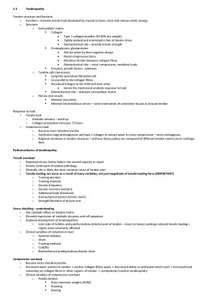 H1 Notes for subject Sports & Manual Therapy completed in Sem 1, 2020. Detailed lecture notes with tables and diagrams. Topics covered (all lectures): - Tendinopathy - Hip - Running tendons - Lumbar spine - The sporting knee - Sports and manual therapy - Foot and ankle - Low back pain part 2 - Thoracic spine - Cervical spine - Shoulder