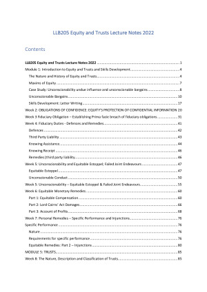 Equity and Trusts full unit lecture notes with prescribed readings added in. Obligations of Confidence, Fudiciary Obligations and Duties, Defences and Remedies, Unconscionability and Equitable Estoppel, Equitable Monetary Remedies, Personal Remedies, Specific Performance and Injunctions. Classification of Trusts, Creation of Express Trusts, Purpose Trusts, Trustee Appointment and Removal of Trustees, Trusteeship Duties, Powers, Discretions and Rights, Rights of Beneficiaries and Remedies for Breach of Trust.