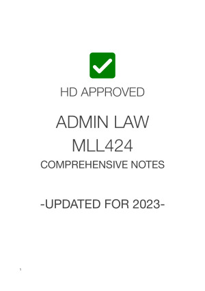 These are the notes I used to score a HD in one of the TOUGHEST subjects in law school: Administrative Law. This subject has changed to an open book exam and therefore these notes are a huge help to get you the marks you deserve. These notes cover: 1 INTRODUCTION TO ADMINISTRATIVE LAW 2 SOURCES AND ELIGIBILITY OF JUDICIAL REVIEW 3 GROUNDS OF REVIEW: INTRO AND PROCEDURAL FAIRNESS 4 GROUNDS OF REVIEW: ERROR IN DETERMINING THE SCOPE OF POWER 5 GROUNDS OF REVIEW: IMPROPER EXERCISE OF POWER 6 CONSEQUENCES OF UNLAWFUL ACTIONS 7 JURISDICTIONAL ERROR 8 ADMINISTRATIVE TRIBUNALS & MERITS REVIEW 9 OMBUDSMAN & INFORMATION DISCLOSURE