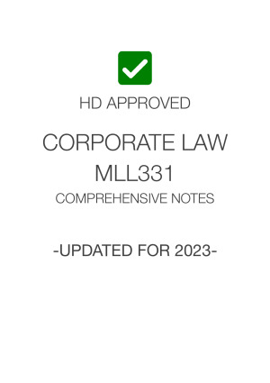 These COMPREHENSIVE notes allowed me to score a HD in Corporate Law in T1 2022. I'm confident they have EVERYTHING you need to do the same: for both the assignment and the exam. Topics Covered: 1. Regulatory Framework >s 51 (xx) Constitution >Corporations Act 2001 (Cth) >Regulators 2. Registration & Its Effects >What is a company? >Separate Legal Entity >Limited Liability >Perpetual Succession >Piercing the Corporate Veil >Corporate Liability for Crimes and Torts 3. Types of Companies >Members Liability >Public and Proprietary Companies >ASX Listed Companies >Holding and Subsidiary Companies >Other bodies >Trustee Companies 4. Constitution and Replaceable Rules >Replaceable Rules >A Company's Constitution >Alteration of the Constitution >Contractual Effect >Non-Compliance with Internal Governance Rules >Limits on Right to Alter Constitution >Variation of Class Rights >Oppression Remedy >Expropriation of Shares 5. The Company's Relations with Outsiders >Contracting Directly >Contracting through an Agent >Actual Authority >Implied actual authority >Apparent authority >Corporate Liability for Contracts Made by Agents >Indoor Management Rule >Statutory Assumptions 6. Promoters & Pre-Registration Contracts >Promoters and their Duties >Pre-Registration Contracts 7. Fundraising >Fundraising by Issuing Shares >Restrictions >Chapter 6D >Variation of Class Rights 8. Share Capital >Maintenance of Share Capital >Share Capital Buy Backs >Share Capital Reductions 9. Membership >Register of Members >Evidence of Shareholding >Liability of Members 10. Dividends >Procedure for Declaring Dividends >Restrictions >Debt Finance 11. Debentures & Personal Property Securities >Debentures >Personal Property Securities Act 12. Directors >Decision Making >Powers >Members Reserved Decision Making Powers >Role Requirements >Types of Directors >Appointment >Disqualification >Board Meetings Corporate Governance >Role & Functions of the Board & Management >Structure & Composition of the Board >Codes of Conduct >Audit Committee >Timely Disclosure >Respect the Rights of Shareholders >Risk Management and Internal Control >Remuneration Duties of Directors >Duty of Care and Diligence >Business Judgment Rule >Delegation and Reliance >Good Faith & Proper Purpose >Fiduciary Obligations >Duty to Retain Discretion >Duty to Avoid Conflict of Interest >Duty to Prevent Insolvent Trading >Remedies and Penalties for Breach of Duty 14. Shareholder's Meetings >Procedural Requirements 15. Member's Statutory Rights & Remedies >Statutory Derivative Action >Oppressive Conduct >Winding Up Company >Statutory Injunction >Right to Inspect Books >Member's Personal Right of Action 16. ASIC Investigation Powers 17. Corporate Insolvency 18. Receivership 19. Voluntary Administration 20. Liquidation