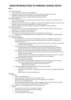 Summarised lecture and tutorial notes for the subject of "Introduction to Forensic Science" including topics: Introduction to crime scenes Introduction to marks and impressions Introduction to Forensic Taphonomy Introduction to Microtraces Introduction to fingerprints Introduction to law Basic criminal and evilaw concepts Basic evidence law concepts Expert evidence and legal issues