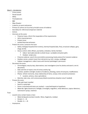 Summarised lecture and tutorial notes for "Crime Scene Investigation" including topics: - Basis of Investigations - Scene Processing - Types of Evidence - Fingerprint Evidence - Footwear Impressions - Clandestine Labs - Large scenes
