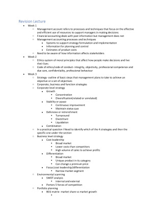 These notes are a summary of all content in the subject. It included the following: - supply chain management -costing techniques -ethics -strategy -Financial and Non-financial performance measurement - Balance scorecard - control - Motivation -sustainability