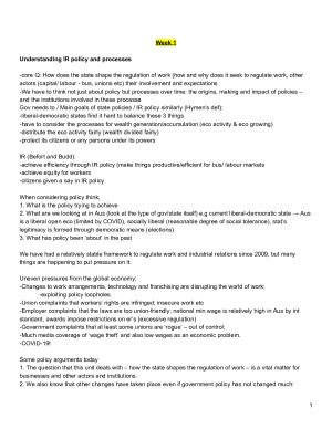 Ranked in the first few highest spots in the cohort using these notes! Contains a synthesis of: Lecture notes, tips and extra information from lecturers and tutors, online modules, and integrates main points from recommended readings. Together these comprehensive notes have equipped me to achieve a High Distinction as it shows an in-depth mastery of a wide range of Industrial Relation and Policy concepts and being up to date with policy related news. I often include source names in the notes so you can demonstrate you are well read when giving written responses, being well read is crucial for pushing you to a higher mark band and standing out in the cohort. My notes are highly detailed and organised by the content week (easy for referring back to during quizzes, assignments, and exams): Week 1 Introduction to Industrial Relations Policy and Processes Week 2 Work and industrial relations today: What are the problems? Week 3 The state: What can and should governments do? Week 4 How did we get here? What has policy been about in Australia? Week 5 What is 'Fair Work' trying to achieve? Week 6 The union 'problem' Week 7 Work and family Week 8 Skills and immigration Week 9 Productivity Week 11 Future industrial relations policy Week 12 Overview and exam primer Contains the following readings: • Multiple Chapter Summaries from Core Course Textbook: Keith Hancock and Russell D Lansbury (eds, 2016). Industrial Relations Reform: Looking to the Future. The Federation Press, Leichhardt. •Clibborn, S.(2020) ‘Australian industrial relations in 2019: The year wage theft went mainstream’. Journal of Industrial Relations,62(3): 331–340. •Kaine, S. (2020) ‘Australian industrial relations and COVID-19’,Journal of Australian Political Economy, 85: 130-137 •(Hyman, 2008). 7 instances of state involvement in IR Hancock 2016 •Befort & Budd (2020) •Julia Gillard foreword published in journal of industrial relations – 2009 •Forward with fairness (Cooper, 2009) •Befort and Budd (2009) •Bray & Stewart (2013) •The declining power & agency of migrant labour in UAs (Wright & Clibborn, 2020) •How economics explains failure of the publicity funded privately delivered training market (Toner, 2018) •Peetz, D., Colley, L. and Nolan, R. (2020) ‘The shock doctrine and industrial relations’ Journal of Australian Political Economy,85: 138-46. •Markey, R.(2020)‘The impact of the COVID-19 virus on industrial relations’, Journal of Australian Political Economy,85: 147-54. •Keating, (1994) Working Nation: The White Paper on Employment and Growth. Australian Government Publishing Service, Canberra (Preamble and Chapter 1: Introduction) •Befort, S. and Budd, J. (2009), Invisible Hands, Invisible Objectives.