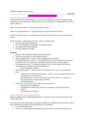 These are my final notes for the end of unit exam. I have organised them into the sections that the exam was split into as uploaded by Unit Chair. The topics covered include: - Key Definitions - Introduction to Social Psychology (Week One + Textbook Chapter Notes) - Culture (Week Two + Lecture Notes + Cloud Notes) - Social Cognition (Week Three + Textbook Chapter Notes) - Social Perception (Week Four + Textbook Chapter Notes) - Self and Identity (Week Five + Textbook Chapter Notes) - Attitudes and Persuasion (Week Six + Textbook Chapter Notes) - Social Influence (Week Seven + Textbook Chapter Notes) - Group Processes (Week Eight + Textbook Chapter Notes) - Prejudice and Intergroup Relations (Week Nine + Textbook Chapter Notes) - Aggression and Prosocial Behaviour (Week Ten + Textbook Chapter Notes) - Liking, Love, and Other Close Relationships (Week Eleven + Textbook Chapter Notes)