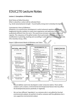 FULL SUMMARY LECTURE NOTES FROM WEEKS 1 - 11 Topics: Lecture 1: Conceptions of Giftedness Lecture 2: Characteristics of Gifted Students Lecture 3: Identification of Gifted Students Lecture 4: Curriculum Differentiation Lecture 5: Curriculum Differentiation 2 Lecture 6: Underachievement Lecture 8: Socio-Affective Issues Lecture 9: Creativity Lecture 10: Program and Provisions Lecture 11: Programs and Provisions 2 (NO LECTURE 7 BECAUSE GUEST SPEAKER/NO PRESENTATION)
