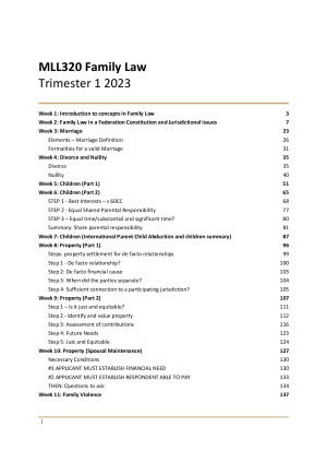 Week 1: Introduction to concepts in Family Law Week 2: Family Law in a Federation Constitution and Jurisdictional Issues Week 3: Marriage Elements – Marriage Definition Formalities for a valid Marriage Week 4: Divorce and Nullity Week 5: Children (Part 1) Week 6: Children (Part 2) STEP 1 - Best Interests – s 60CC STEP 2 - Equal Shared Parental Responsibility STEP 3 – Equal time/substantial and significant time? Summary: Share parental responsibility Week 7: Children (International Parent Child Abduction and children summary) Week 8: Property (Part 1) Steps: property settlement for de facto relationships Step 1 - De facto relationship? Step 2: De facto financial cause Step 3: When did the parties separate? Step 4: Sufficient connection to a participating jurisdiction? Week 9: Property (Part 2) Step 1 – Is it just and equitable? Step 2 - Identify and value property Step 3: Assessment of contributions Step 4: Future Needs Step 5: Just and Equitable Week 10: Property (Spousal Maintenance) Necessary Conditions #1 APPLICANT MUST ESTABLISH FINANCIAL NEED #2 APPLICANT MUST ESTABLISH RESPONDENT ABLE TO PAY THEN: Questions to ask: Week 11: Family Violence