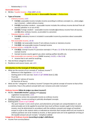 Excellent, super detailed course notes and scaffolds prepared by a Distinction student!!! Perfect and very useful for final exam revision!! Includes content from lectures, seminars and textbook, and legislation and case law!! Topics 1) Introduction to Tax and the Australian Tax System 2) Concepts of Income 3) Income from Property and Capital Gains Tax 4) Income from Services and Fringe Benefits Tax 5) Business Income 6) Deductions – Relevance 7) Deductions – Trading Stock (business taxation) 8) Deductions – The capital/revenue distinction 9) Deductions – Depreciation (business taxation) 10) Entity Taxation: Partnerships, Trusts, and Companies (Imputation) 11) Goods and Services Tax 12) Tax Administration 13) Ethical conduct and rules to counter tax avoidance