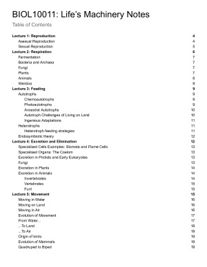 These notes cover first year undergraduate biology. The topics covered include: - Evolution - Biodiversity - Sensing and Responding - Population Ecology - Community Ecology - Climate Change and Conservation All lectures from the course BIOL10011: Life's Machinery are covered, from weeks 1 to 12.
