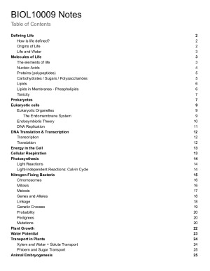 These notes cover all lecture content in BIOL10009: Life's Machinery. The topics covered include: Defining Life Molecules of Life Prokaryotes Eukaryotic cells DNA Translation & Transcription Energy in the Cell Cellular Respiration Photosynthesis Nitrogen-Fixing Bacteria Plant Growth Water Potential Transport in Plants Animal Embryogenesis Animal Tissue Types Homeostasis Animal Hormones Plant Hormones Circulatory System Nervous System Gas Exchange Reproductive Systems Digestion Fluid Regulation Excretion Temperature and Organisms C4 and CAM Photosynthesis Immune System Disease Cance Human Impact on Biological Variation