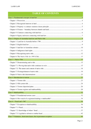 These are comprehensive course notes that helped me achieve high distinctions in the midterm and finals. They summarise the readings and cases in detail, and are a great resource for class participation (which makes up 20% of the course marks!) Notes Structure: They are structured around the 17 content classes in the course, and each 'chapter' in the readings. Notes Organisation: They are colour-coordinated. Key-points and takeaways are highlighted or in a different font. Several class notes are accompanied by colourful tables or flowcharts I created, that synthesise key principles. The topics included are: 1. Fundamental concepts in land law 2. Origins of Australian land law 3. Native Title 4. Introduction to Torrens 5. Indefeasibility 6. Fraud and s 56C 7. Volunteers, short-term leases and in personam exception 8. Overriding statutes 9. Caveats, competing interests 10. Co-ownership 11-13. Leases 14. Mortgages 15-16. Easements 17. Freehold covenants Good luck with your studies!