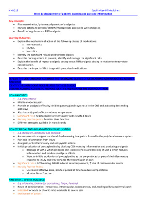 My study notes for HNN215 cover the learning objectives from week 1-7 which includes a mixture of content from readings, lecture/online content and after seminar discussion. Week 1: Management of patients experiencing pain and inflammation Week 2: Management of patients experiencing infection Week 3: Management of patients experiencing cardiovascular symptoms (1) Week 4: Management of patients experiencing cardiovascular symptoms (2) Week 5: Management of patients experiencing respiratory symptoms Week 6: Management of patients experiencing GIT & endocrine dysfunction Week 7: Management of patients experiencing GIT & cellular dysfunction