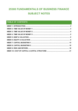 Great for exam prep, easy to understand, includes all key information. All 11 topics included: - WEEK 1: INTRODUCTION - WEEK 2: TIME VALUE OF MONEY 1 - WEEK 3: TIME VALUE OF MONEY 2 - WEEK 4: TIME VALUE OF MONEY 3 - WEEK 5: DEBT & VALUATION - WEEK 6: EQUITY & VALUATION - WEEK 7: CAPITAL BUDGETING 1 - WEEK 8: CAPITAL BUDGETING 2 - WEEK 9: RISK AND RETURN - WEEK 10: COST OF CAPITAL & CAPITAL STRUCTURE