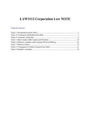 A detailed and colour coded HD Corporation law exam note that enables me to get a HD in 2023. Good luck with your exam! : ) Topic includes: Topic 2: Incorporation and its effect Topic 3: Constitution and Replacement Rule Topic 4: Corporate contracting Topic 5: Share Capital, Debt Capital, and Dividend Topic 6: Directors, members and Corporate Decision-Making Topic 7: Director’s duties Topic 8: Consequence of breach of general law duties Topic 9: Member’s remedies *Please noted that the topics on related party transactions and corporate mortality are not examinable in 2023 (Monash uni) and therefore not included in this note.