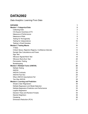 Included are 37 pages of detailed and concise notes that cover everything you need to know to achieve a high distinction in DATA2002. The notes are a combination of lecture content, key tutorial information, learnings from quizzes, as well as my personal breakdowns of confusing concepts. These notes were key to me achieving an HD and by studying them I believe anyone can achieve at least a distinction. I am now doing a data science internship and continue to refer to them. Topics Included: Module 1: Categorical Data - Collecting Data - Chi-Square Goodness of Fit - Measures of Performance - Measures of Risk - Testing for Homogeneity - Testing for Independence - Testing in Small Samples Module 2: Testing Means - T-Tests - Critical Values, Rejection Regions, Confidence Intervals - Sample Size Calculations and Power - Sign Test - Wilcoxon Signed-Rank Test - Wilcoxon Rank-Sum Test - Permutation Testing - Bootstrapping Module 3: Multiple Factor (ANOVA) - Multiple Testing - ANOVA - ANOVA Contrasts - ANOVA Post Hoc - When ANOVA Assumptions Fail - Two Way ANOVA Module 4: Learning and Prediction - Simple Linear Regression - Multiple Regression and Model Selection - Multiple Regression Prediction and Performance - Logistic Regression