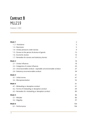 Week 1 - Avoidance - Rescission - Undue pressure under duress - Duress to the person & duress of goods - Economic duress - Remedies for duress and statutory duress Week 2 - Undue Influence - Categories of undue influence - Unconscionable conduct - equitable unconscionable conduct - Statutory unconscionable conduct Week 3 - Unfair terms - Misrepresentation Week 4 - Misleading or deceptive conduct - Forms of misleading or deceptive conduct - Remedies for misleading or deceptive conduct Week 5 - Mistake - Illegality Week 6 - Performance - Termination by agreement Week 7 - Termination for breach - Repudiation - Election to terminate a contract - The consequences of termination Week 8 - Termination by frustration - Examples of frustration - Limits on the application of the doctrine of frustration - The effects of frustration Week 9 - Damages - Restrictions on Damages Awards Week 10 - Common Law Remedies - Equitable Remedies