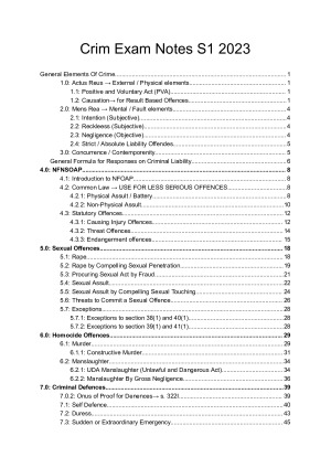 - Breakdown of general elements of a crime + legal tests for each element - General formula / structure for responses about criminal liability (with checklist for each element) - Breakdown of each individual offence covered during the semester and checklists of elements that must be satisfied in order to make out criminal liability - Breakdown of criminal defences - notes on relevant cases to reference for different offences or legal principles - colour coding for mens rea vs actus reus - offence-specific sentence starters for responses in exams - contents page with page numbers for easy access 9
